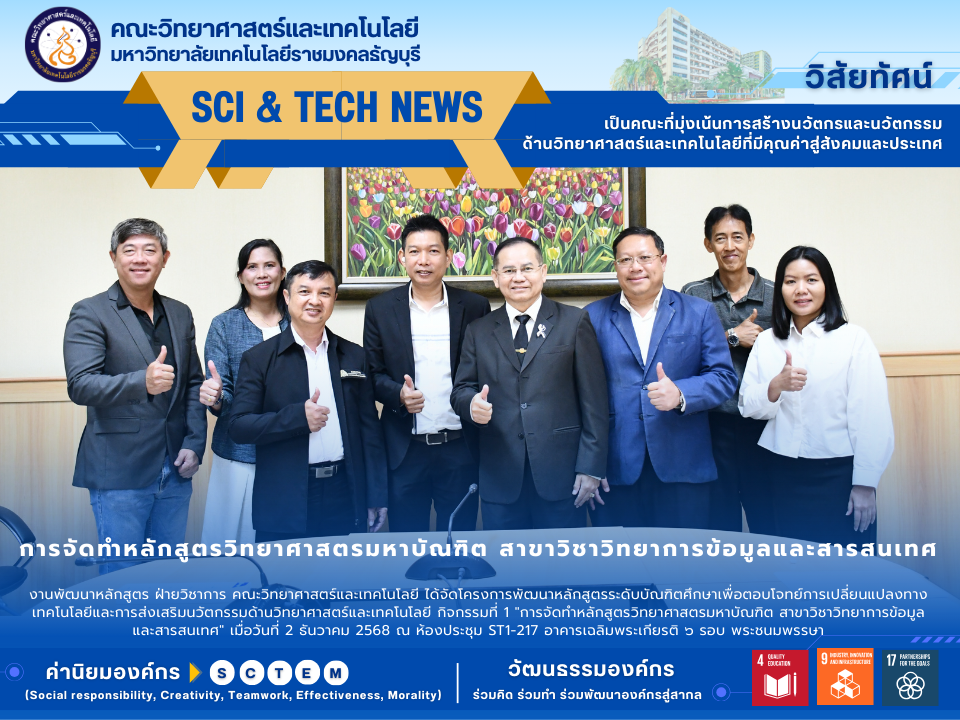December 3, 2025งานพัฒนาหลักสูตร ฝ่ายวิชาการ คณะวิทยาศาสตร์และเทคโนโลยี มหาวิทยาลัยเทคโนโลยีราชมงคลธัญบุรี ได้จัดโครงการพัฒนาหลักสูตรระดับบัณฑิตศึกษาเพื่อตอบโจทย์การเปลี่ยนแปลงทางเทคโนโลยีและการส่งเสริมนวัตกรรมด้านวิทยาศาสตร์และเทคโนโลยี กิจกรรมที่ 1 “การจัดทำหลักสูตรวิทยาศาสตรมหาบัณฑิต สาขาวิชาวิทยาการข้อมูลและสารสนเทศ” เมื่อวันที่ 2 ธันวาคม 2568 ณ ห้องประชุม ST1-217 อาคารเฉลิมพระเกียรติ ๖ รอบ พระชนมพรรษา