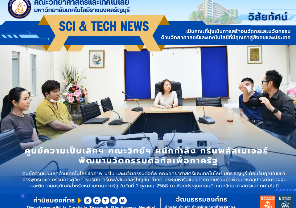 October 2, 2025ศููนย์ความเป็นเลิศด้านเทคโนโลยีชีวภาพ นาโน และนวัตกรรมดิจิทัล นำโดย ผศ.ดร.อารณี โชติโก รองคณบดีฝ่ายวิจัยพัฒนาและบริการวิชาการ ผศ.ดร.พิเชฐ คุณากรวงศ์ หัวหน้าศูนย์ความเป็นเลิศฯ ร่วมกับ รศ.ดร.ปรเมนทร์ พอใจ รศ. ดร.อทิพงศ์ บุตรชานนท์ สาขาวิชาฟิสิกส์ ต้อนรับคุณณิชชา สารพุทธิเดชา กรรมการผู้จัดการบริษัท กรีนพลัสเนเจอร์โซลูชั่น จำกัด ประชุมหารือแนวทางความร่วมมือพัฒนาชุดอุปกรณ์ตรวจจับและติดตามครุภัณฑ์สำหรับหน่วยงานภาครัฐ ในวันที่ 1 ตุลาคม 2568 ณ ห้องประชุมคณบดี คณะวิทยาศาสตร์และเทคโนโลยี