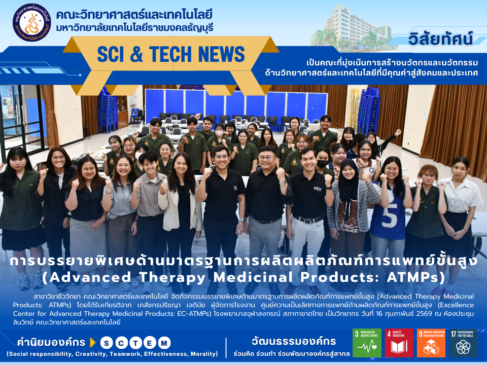February 14, 2026สาขาวิชาชีววิทยา คณะวิทยาศาสตร์และเทคโนโลยี มหาวิทยาลัยเทคโนโลยีราชมงคลธัญบุรี จัดกิจกรรมบรรยายพิเศษในหัวข้อ “มาตรฐานการผลิตผลิตภัณฑ์การแพทย์ขั้นสูง (Advanced Therapy Medicinal Products: ATMPs)” เมื่อวันที่ 16 กุมภาพันธ์ 2569 ณ ห้องประชุมลินวิทย์ คณะวิทยาศาสตร์และเทคโนโลยี