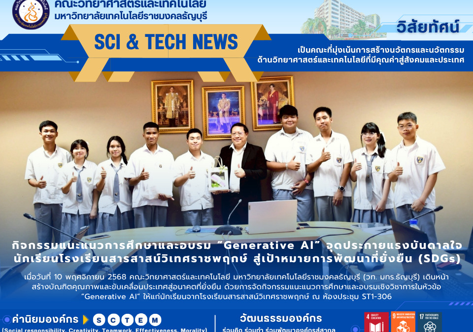 November 11, 2025คณะวิทยาศาสตร์และเทคโนโลยี มหาวิทยาลัยเทคโนโลยีราชมงคลธัญบุรี จัดกิจกรรมแนะแนวการศึกษาและอบรมเชิงวิชาการในหัวข้อ “Generative AI” เมื่อวันที่ 10 พฤศจิกายน 2568 เพื่อเสริมสร้างความรู้และจุดประกายแรงบันดาลใจด้านเทคโนโลยีสมัยใหม่ให้แก่นักเรียนจากโรงเรียนสารสาสน์วิเทศราชพฤกษ์ ซึ่งเป็นส่วนหนึ่งของการขับเคลื่อนสู่ เป้าหมายการพัฒนาที่ยั่งยืน (Sustainable Development Goals: SDGs) ขององค์การสหประชาชาติ