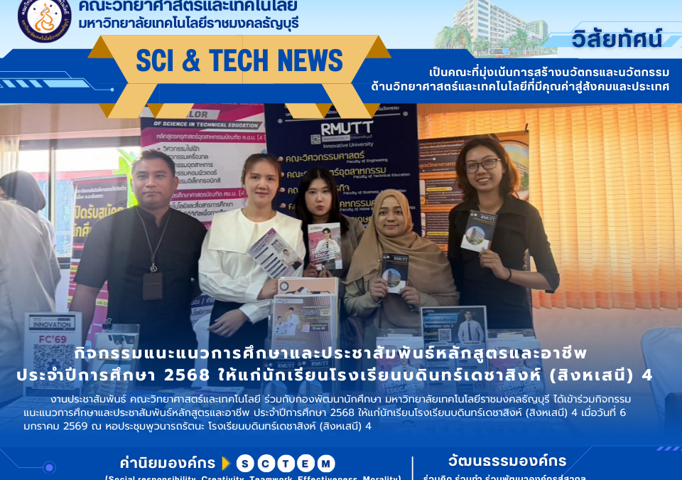 January 8, 2026งานประชาสัมพันธ์ คณะวิทยาศาสตร์และเทคโนโลยี ร่วมกับกองพัฒนานักศึกษา มหาวิทยาลัยเทคโนโลยีราชมงคลธัญบุรี ได้เข้าร่วมกิจกรรมแนะแนวการศึกษาและประชาสัมพันธ์หลักสูตรและอาชีพ ประจำปีการศึกษา 2568 ให้แก่นักเรียนโรงเรียนบดินทร์เดชาสิงห์ (สิงหเสนี) 4 เมื่อวันที่ 6 มกราคม 2569 ณ หอประชุมพูวนารถรัตนะ โรงเรียนบดินทร์เดชาสิงห์ (สิงหเสนี) 4