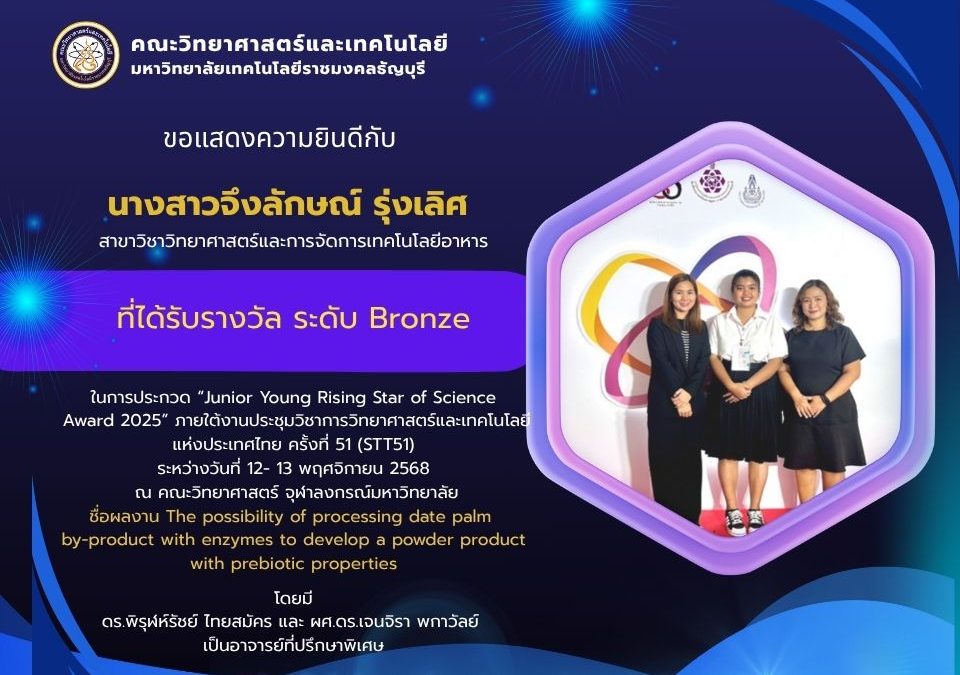 November 19, 2025คณะวิทยาศาสตร์และเทคโนโลยี ขอแสดงความยินดีกับนักเรียนและนักศึกษา สาขาวิชาวิทยาศาสตร์และการจัดการเทคโนโลยีอาหาร ที่ได้รับรางวัลระดับ Bronze ในการประกวด “Young Rising Star of Science Award 2025” ภายใต้งานประชุมวิชาการวิทยาศาสตร์และเทคโนโลยีแห่งประเทศไทย ครั้งที่ 51 The 51st International Congress on Science, Technology and Technology – based Innovation (STT51) ณ คณะวิทยาศาสตร์ จุฬาลงกรณ์มหาวิทยาลัย ระหว่างวันที่ 12 – 13 พฤศจิกายน 2568