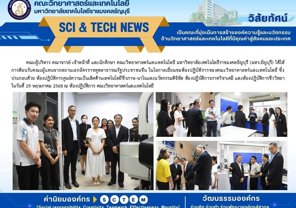 May 30, 2025คณะผู้บริหาร คณาจารย์ เจ้าหน้าที่ และนักศึกษา คณะวิทยาศาสตร์และเทคโนโลยี มหาวิทยาลัยเทคโนโลยีราชมงคลธัญบุรี (มทร.ธัญบุรี) ได้ให้การต้อนรับคณะผู้แทนจากสถานเอกอัครราชทูตสาธารณรัฐประชาชนจีน ในโอกาสเยี่ยมชมห้องปฏิบัติการของคณะวิทยาศาสตร์และเทคโนโลยี ซึ่งประกอบด้วย ห้องปฏิบัติการศูนย์ความเป็นเลิศด้านเทคโนโลยีชีวภาพ-นาโนและนวัตกรรมดิจิทัล ห้องปฏิบัติการภาควิชาเคมี และห้องปฏิบัติการชีววิทยา ในวันที่ 29 พฤษภาคม 2568 ณ ห้องปฏิบัติการ คณะวิทยาศาสตร์และเทคโนโลยี