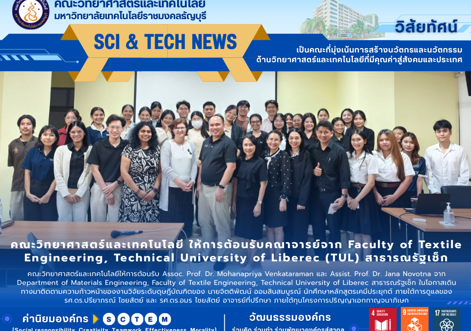 November 21, 2025คณะวิทยาศาสตร์และเทคโนโลยี มหาวิทยาลัยเทคโนโลยีราชมงคลธัญบุรี ให้การต้อนรับ Assoc. Prof. Dr. Mohanapriya Venkataraman และ Assist. Prof. Dr. Jana Novotna จาก Department of Materials Engineering, Faculty of Textile Engineering, Technical University of Liberec (TUL) สาธารณรัฐเช็ก ในโอกาสเดินทางมาติดตามความก้าวหน้าของงานวิจัยระดับดุษฎีบัณฑิตของ นายจิตติพัฒน์ ออมสินสมบูรณ์ นักศึกษาหลักสูตรเคมีประยุกต์ ภายใต้การดูแลของ รศ.ดร.ปรียาภรณ์ ไชยสัตย์ และ รศ.ดร.อมร ไชยสัตย์ อาจารย์ที่ปรึกษา ซึ่งได้รับทุนโครงการปริญญาเอกกาญจนาภิเษก