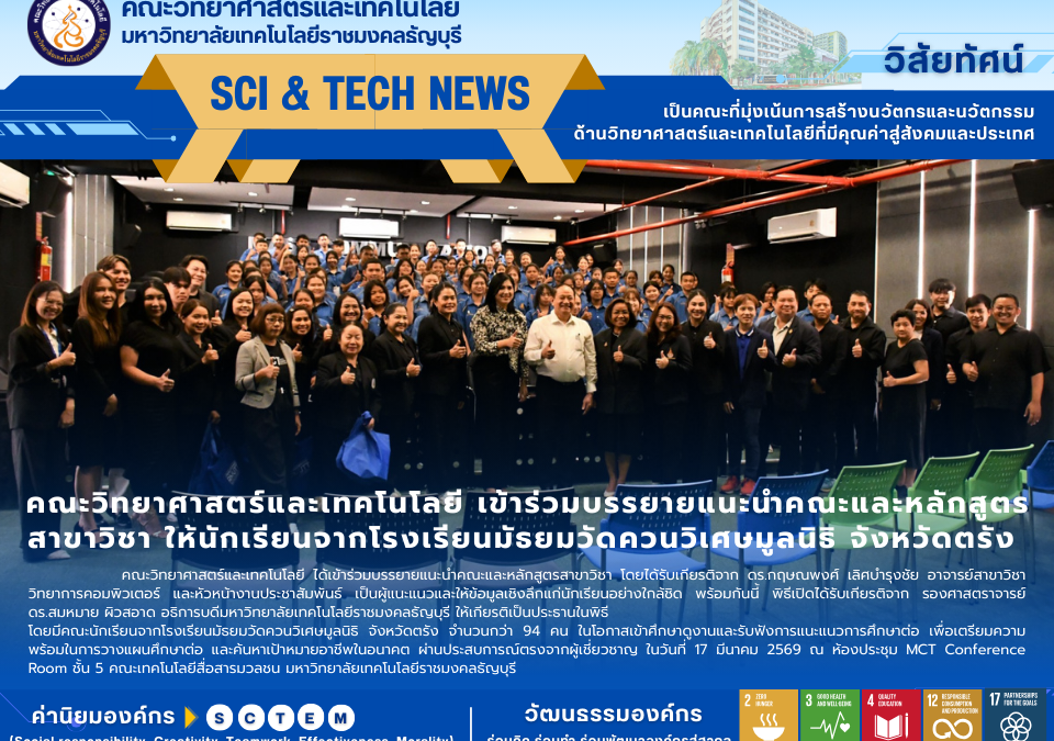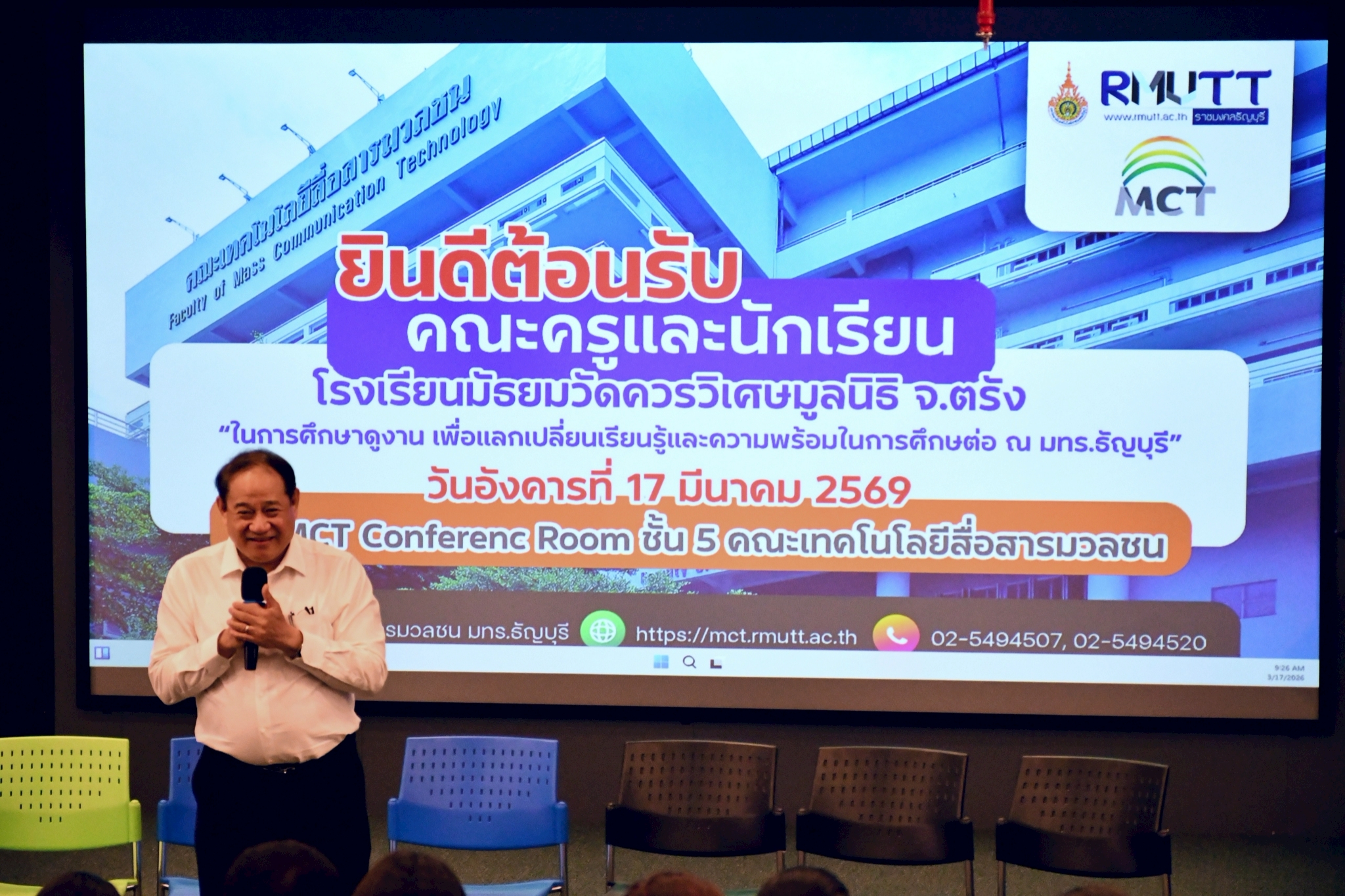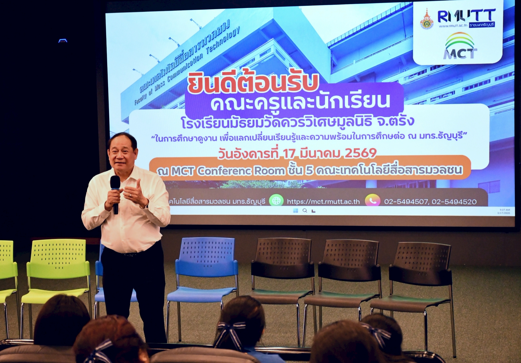 โดยมีคณะนักเรียนจากโรงเรียนมัธยมวัดควนวิเศษมูลนิธิ จังหวัดตรัง จำนวนกว่า 94 คน ในโอกาสเข้าศึกษาดูงานและรับฟังการแนะแนวการศึกษาต่อ เพื่อเตรียมความพร้อมในการวางแผนศึกษาต่อ และค้นหาเป้าหมายอาชีพในอนาคต ผ่านประสบการณ์ตรงจากผู้เชี่ยวชาญ ในวันที่ 17 มีนาคม 2569 ณ ห้องประชุม MCT Conference Room ชั้น 5 คณะเทคโนโลยีสื่อสารมวลชน มหาวิทยาลัยเทคโนโลยีราชมงคลธัญบุรี
