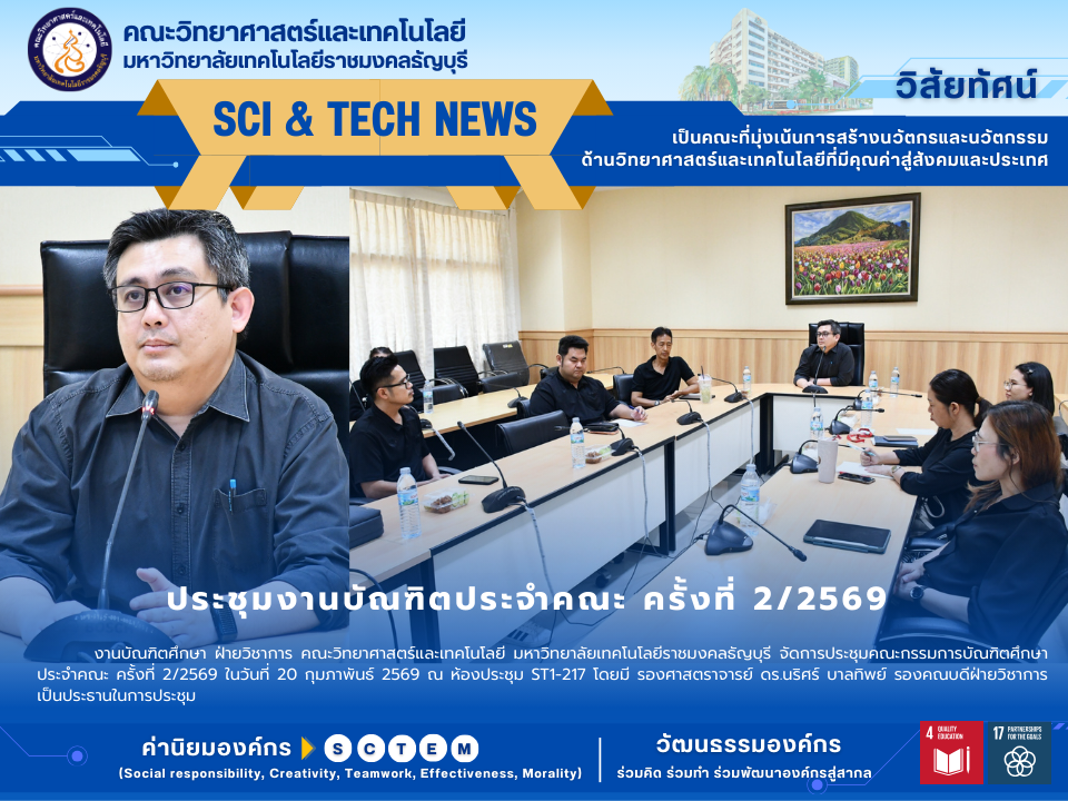 February 20, 2026งานบัณฑิตศึกษา ฝ่ายวิชาการ คณะวิทยาศาสตร์และเทคโนโลยี มหาวิทยาลัยเทคโนโลยีราชมงคลธัญบุรี จัดการประชุมคณะกรรมการบัณฑิตศึกษาประจำคณะ ครั้งที่ 2/2569 ในวันที่ 20 กุมภาพันธ์ 2569 ณ ห้องประชุม ST1-217 โดยมี รองศาสตราจารย์ ดร.นริศร์ บาลทิพย์ รองคณบดีฝ่ายวิชาการ เป็นประธานในการประชุม