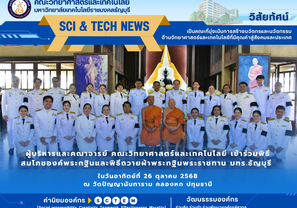 October 27, 2025ผู้บริหารและคณาจารย์ คณะวิทยาศาสตร์และเทคโนโลยี เข้าร่วมพิธีสมโภชองค์พระกฐินและพิธีถวายผ้าพระกฐินพระราชทาน มทร.ธัญบุรี ในวันอาทิตย์ที่ 26 ตุลาคม 2568 ณ วัดปัญญานันทาราม คลองหก ปทุมธานี