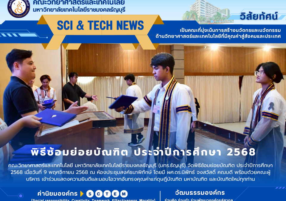 November 11, 2025คณะวิทยาศาสตร์และเทคโนโลยี มหาวิทยาลัยเทคโนโลยีราชมงคลธัญบุรี จัดพิธีซ้อมย่อยบัณฑิต ประจำปีการศึกษา 2568 เมื่อวันที่ 9 พฤศจิกายน 2568 ณ ห้องประชุมสงค์ธนาพิทักษ์ โดยมี ผู้ช่วยศาสตราจารย์ ดร.นิพัทธ์ จงสวัสดิ์ คณบดี พร้อมด้วยคณะผู้บริหาร เข้าร่วมแสดงความยินดีและมอบโอวาทอันทรงคุณค่าแก่ดุษฎีบัณฑิต มหาบัณฑิต และบัณฑิตใหม่ทุกท่าน