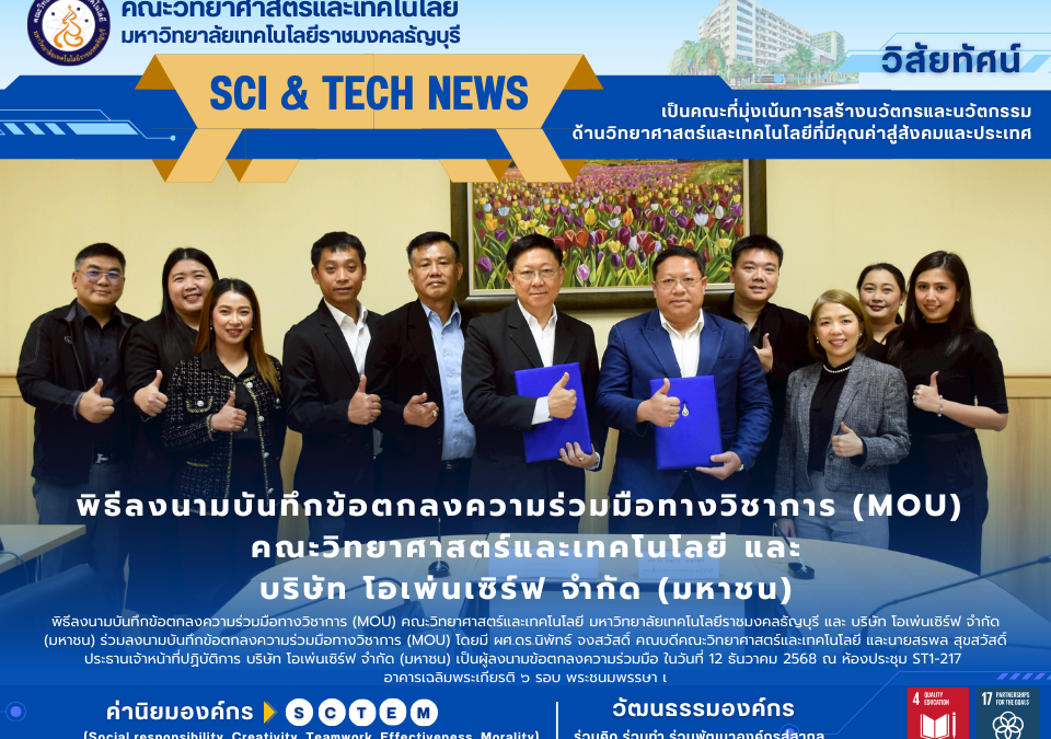 December 13, 2025คณะวิทยาศาสตร์และเทคโนโลยี มหาวิทยาลัยเทคโนโลยีราชมงคลธัญบุรี (มทร.ธัญบุรี) เดินหน้าขับเคลื่อนยุทธศาสตร์การผลิตบัณฑิตนักปฏิบัติ โดยร่วมมือกับภาคเอกชนชั้นนำ จัดพิธีลงนามบันทึกข้อตกลงความร่วมมือทางวิชาการ (MOU) ระหว่าง คณะวิทยาศาสตร์และเทคโนโลยี และ บริษัท โอเพ่นเซิร์ฟ จำกัด (มหาชน) เมื่อวันที่ 12 ธันวาคม 2568 ณ ห้องประชุม ST1-217 อาคารเฉลิมพระเกียรติ ๖ รอบ พระชนมพรรษา