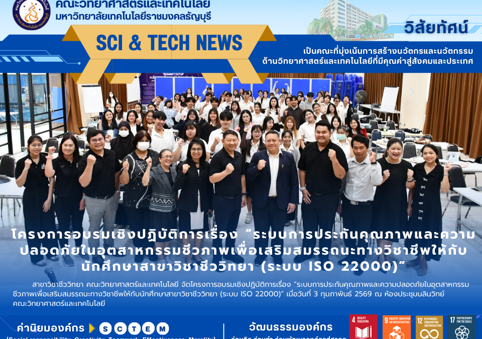 February 2, 2026สาขาวิชาชีววิทยา คณะวิทยาศาสตร์และเทคโนโลยี จัดโครงการอบรมเชิงปฏิบัติการเรื่อง “ระบบการประกันคุณภาพและความปลอดภัยในอุตสาหกรรมชีวภาพเพื่อเสริมสมรรถนะทางวิชาชีพให้กับนักศึกษาสาขาวิชาชีววิทยา (ระบบ ISO 22000)” เมื่อวันที่ 3 กุมภาพันธ์ 2569 ณ ห้องประชุมนลินวิทย์ คณะวิทยาศาสตร์และเทคโนโลยี