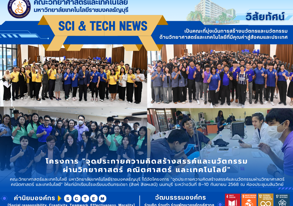 September 11, 2025คณะวิทยาศาสตร์และเทคโนโลยี มหาวิทยาลัยเทคโนโลยีราชมงคลธัญบุรี ได้จัดโครงการ “จุดประกายความคิดสร้างสรรค์และนวัตกรรมผ่านวิทยาศาสตร์ คณิตศาสตร์ และเทคโนโลยี” ให้แก่นักเรียนโรงเรียนบดินทรเดชา (สิงห์ สิงหเสนี) นนทบุรี ระหว่างวันที่ 8–10 กันยายน 2568 ณ ห้องประชุมนลินวิทย์ โดยมี ผู้ช่วยศาสตราจารย์ ดร.นิพัทธ์ จงสวัสดิ์ คณบดีคณะวิทยาศาสตร์และเทคโนโลยี ให้เกียรติเป็นประธานในพิธีเปิด โครงการนี้มุ่งเน้นการพัฒนาศักยภาพเยาวชนผ่านการเรียนรู้แบบ Hands-on Learning ที่สนุกสนานและท้าทาย ทั้งในด้านวิทยาศาสตร์ คณิตศาสตร์ ฟิสิกส์ และเทคโนโลยี เพื่อเตรียมความพร้อมสำหรับโลกอนาคต โดยกิจกรรมที่โดดเด่นประกอบด้วย