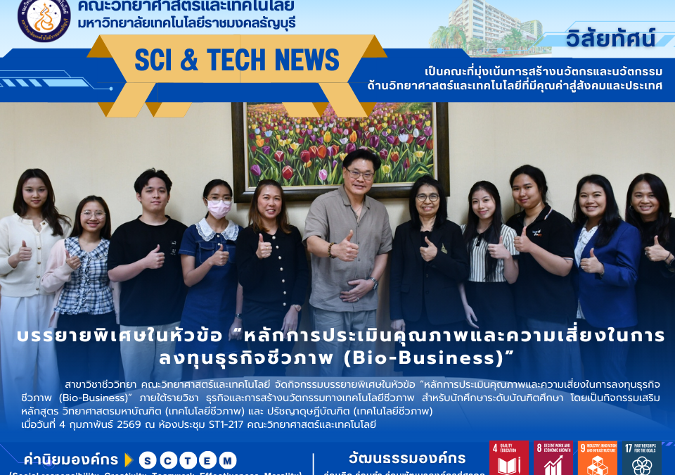 February 6, 2026สาขาวิชาชีววิทยา คณะวิทยาศาสตร์และเทคโนโลยี จัดกิจกรรมบรรยายพิเศษในหัวข้อ “หลักการประเมินคุณภาพและความเสี่ยงในการลงทุนธุรกิจชีวภาพ (Bio-Business)” ภายใต้รายวิชา ธุรกิจและการสร้างนวัตกรรมทางเทคโนโลยีชีวภาพ สำหรับนักศึกษาระดับบัณฑิตศึกษา โดยเป็นกิจกรรมเสริมหลักสูตร วิทยาศาสตรมหาบัณฑิต (เทคโนโลยีชีวภาพ) และ ปรัชญาดุษฎีบัณฑิต (เทคโนโลยีชีวภาพ)