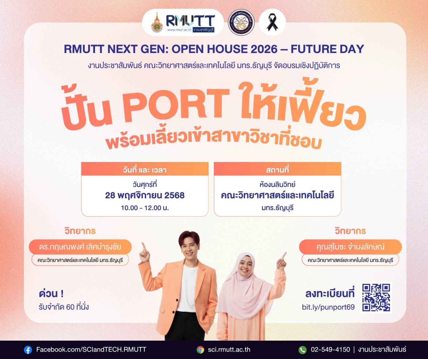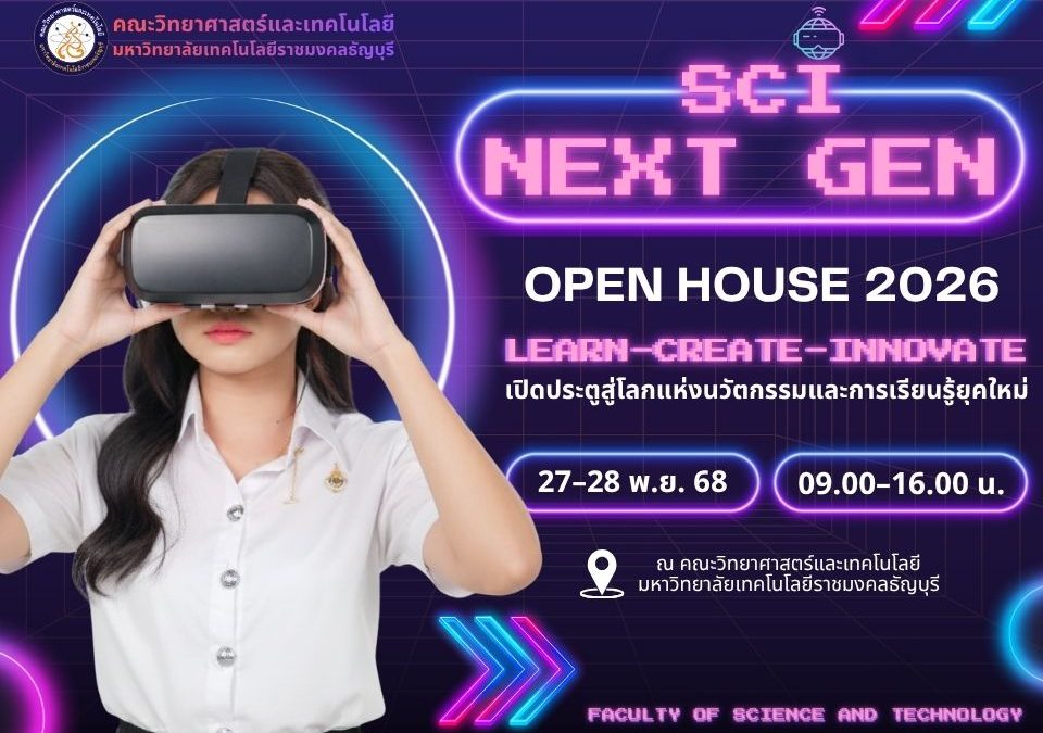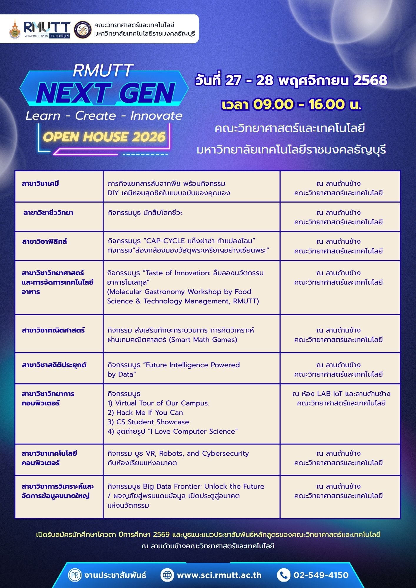 November 13, 2025คณะวิทยาศาสตร์และเทคโนโลยี ขอเชิญนักเรียน นักศึกษา และผู้สนใจ เข้าร่วมงาน “RMUTT NEXT GEN : Learn - Create - Innovate” เปิดประตูสู่โลกแห่งนวัตกรรมและการเรียนรู้ยุคใหม่