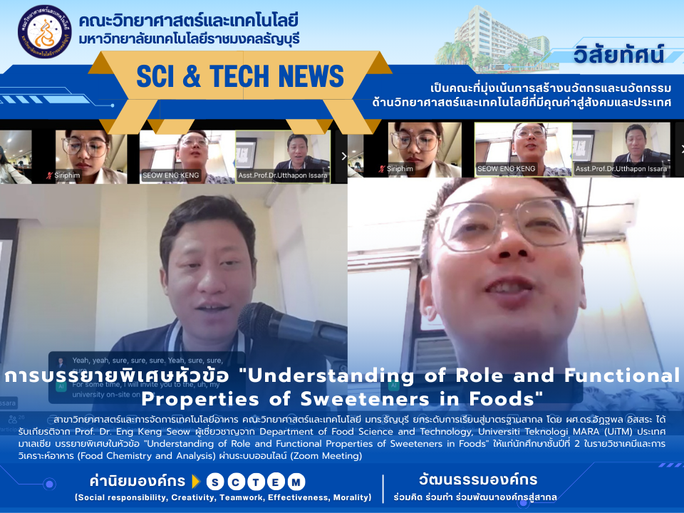 สาขาวิทยาศาสตร์และการจัดการเทคโนโลยีอาหาร คณะวิทยาศาสตร์และเทคโนโลยี มทร.ธัญบุรี ยกระดับการเรียนสู่มาตรฐานสากล โดย ผศ.ดร.อัฏฐพล อิสสระ ได้รับเกียรติจาก Prof. Dr. Eng Keng Seow ผู้เชี่ยวชาญจาก Department of Food Science and Technology, Universiti Teknologi MARA (UiTM) ประเทศมาเลเซีย บรรยายพิเศษในหัวข้อ… อ่านเพิ่มเติม การบรรยายพิเศษหัวข้อ “Understanding of Role and Functional Properties of Sweeteners in Foods”