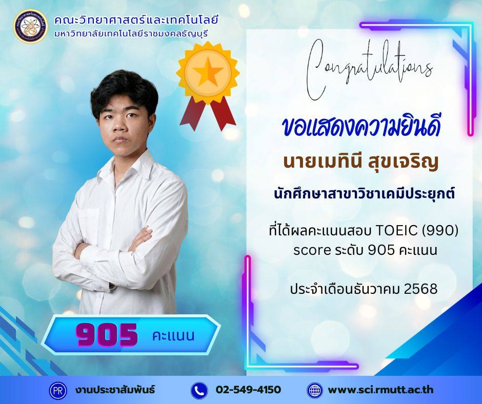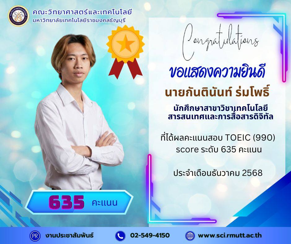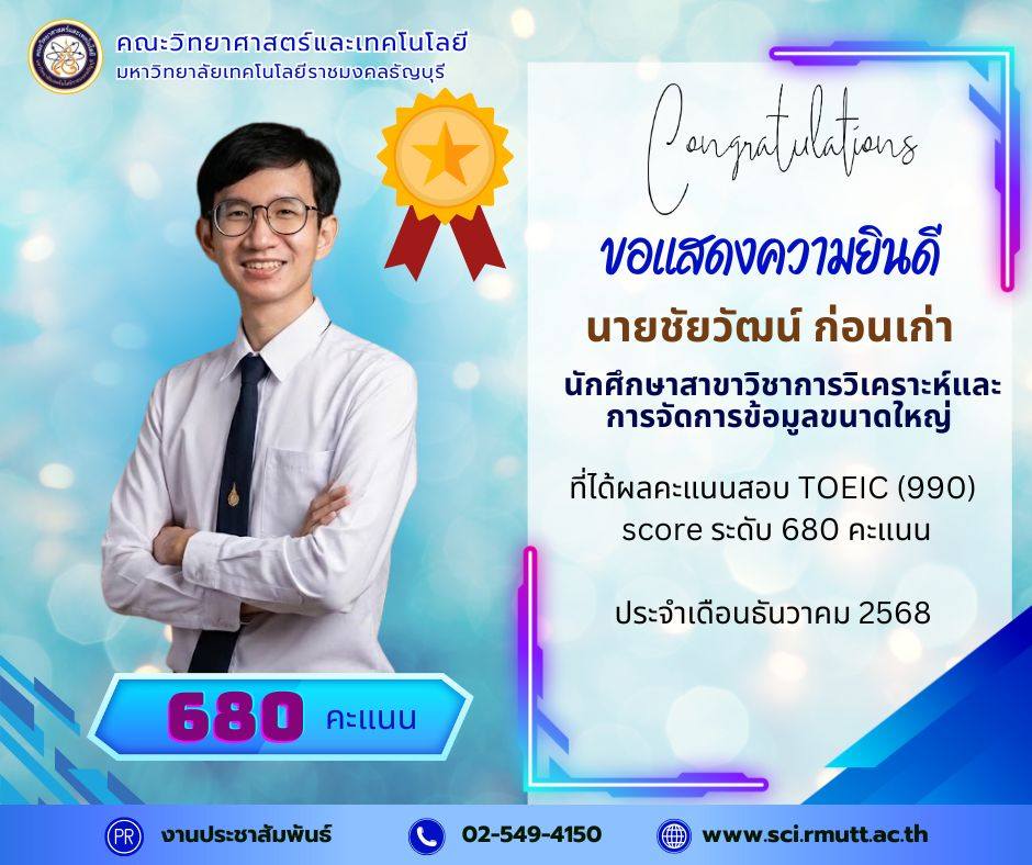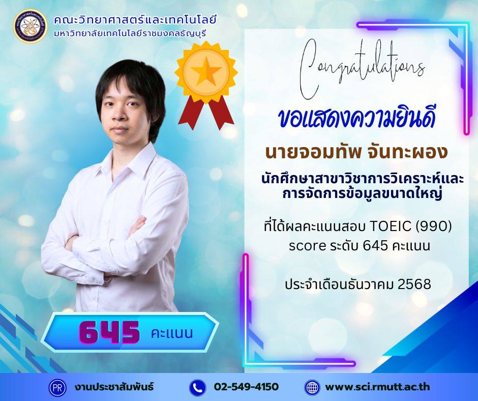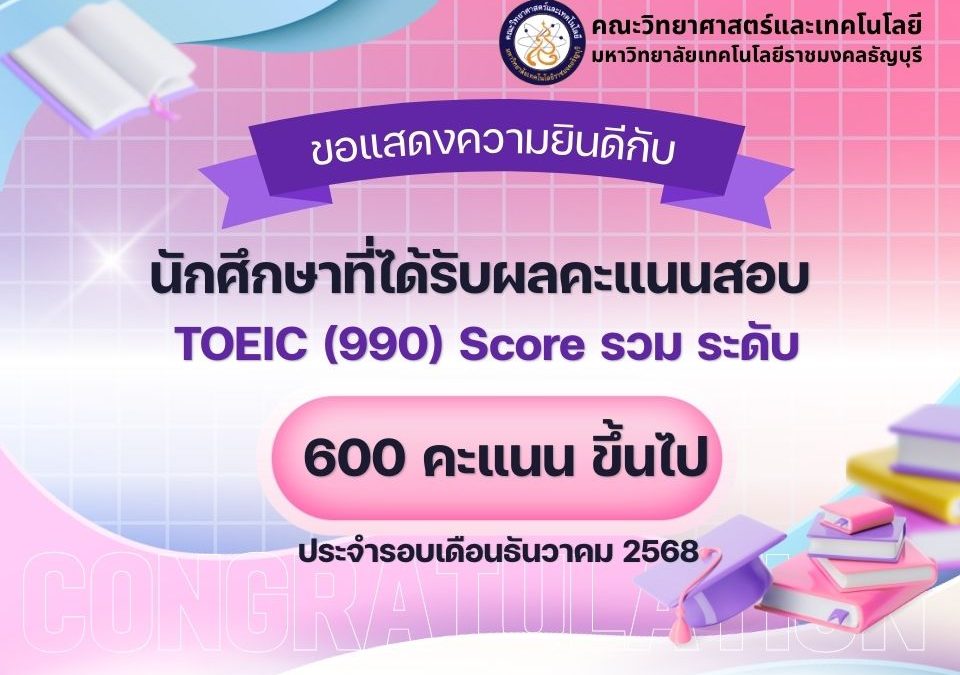 December 22, 2025คณะวิทยาศาสตร์และเทคโนโลยี มหาวิทยาลัยเทคโนโลยีราชมงคลธัญบุรี (RMUTT) ขอแสดงความชื่นชมและยินดีเป็นอย่างยิ่งกับนักศึกษาคนเก่งของเรา ที่ได้รับผลคะแนนสอบ TOEIC (990) Score รวม ระดับ 600 คะแนน ขึ้นไป ประจำรอบเดือนธันวาคม 2568
