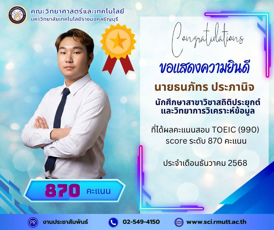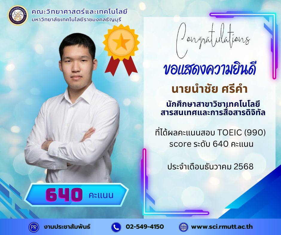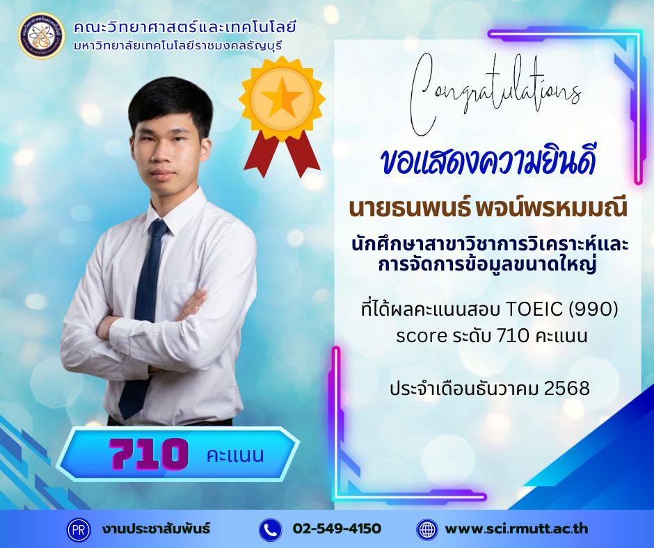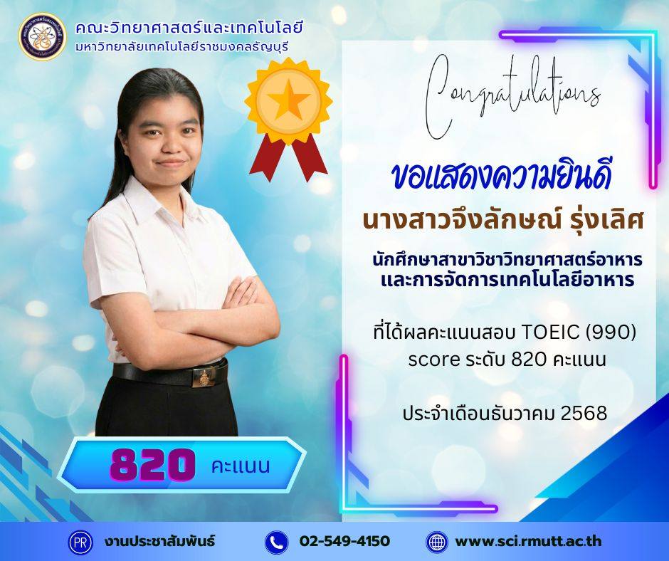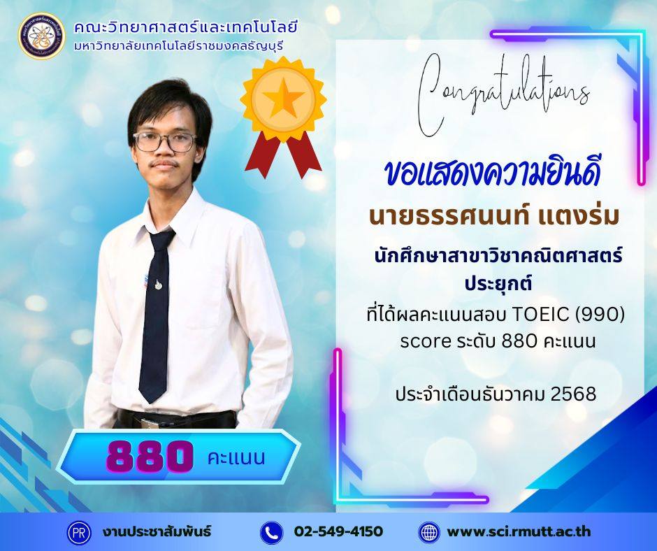 December 22, 2025คณะวิทยาศาสตร์และเทคโนโลยี มหาวิทยาลัยเทคโนโลยีราชมงคลธัญบุรี (RMUTT) ขอแสดงความชื่นชมและยินดีเป็นอย่างยิ่งกับนักศึกษาคนเก่งของเรา ที่ได้รับผลคะแนนสอบ TOEIC (990) Score รวม ระดับ 600 คะแนน ขึ้นไป ประจำรอบเดือนธันวาคม 2568